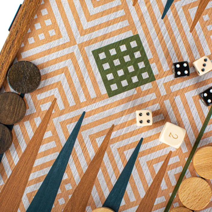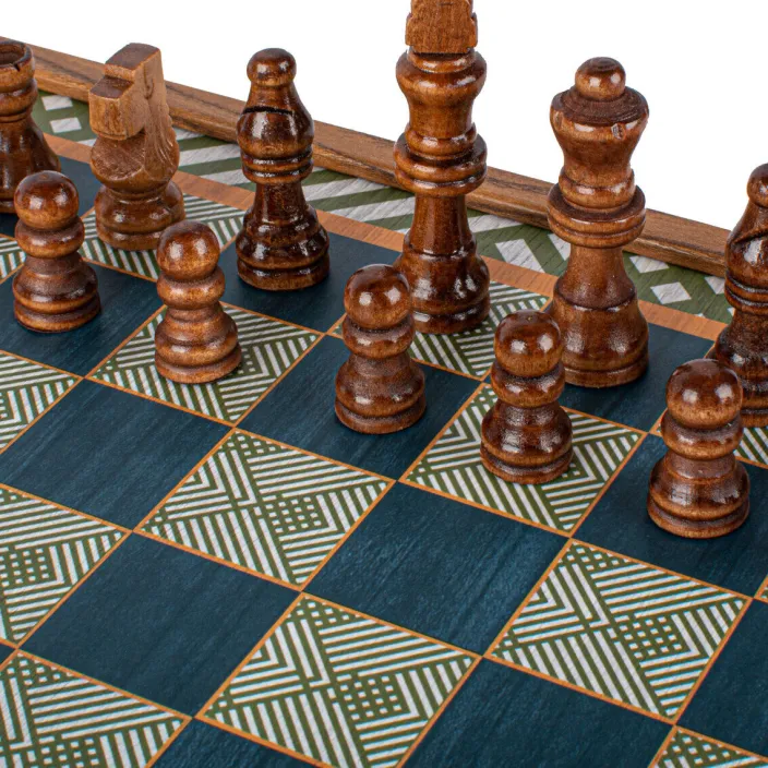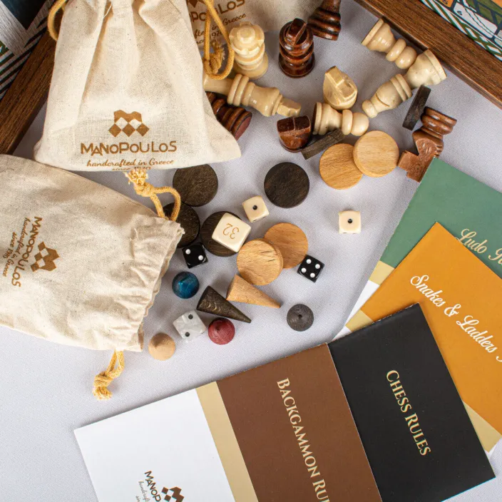 - 32 Holzschachfiguren, 32 Holz-Backgammon-Spielsteine, 16 farbige Holzspielfiguren, 5 Würfel, 1 Verdoppelungswürfel