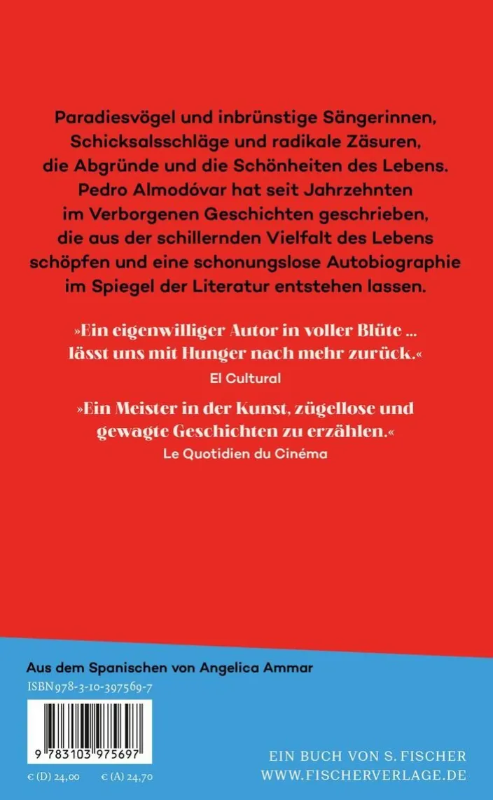 Befreiung und Liebe sind die Lebensthemen von Pedro Almodóvar, einem der wichtigsten Filmemacher der Gegenwart, der auch ein leidenschaftlicher Schriftsteller ist. Mit zwölf Erzählungen betritt Pedro Almodóvar nun die literarische Bühne: Sie handeln von Paradiesvögeln und inbrünstigen Sängerinnen, von Schicksalsschlägen und radikalen Zäsuren, sie verhandeln die Abgründe und die Schönheit des Lebens. Wie kein anderer mischt dieser große Geschichtenerzähler tiefe Melancholie und grellen Humor – nicht zuletzt im Blick auf sich selbst.