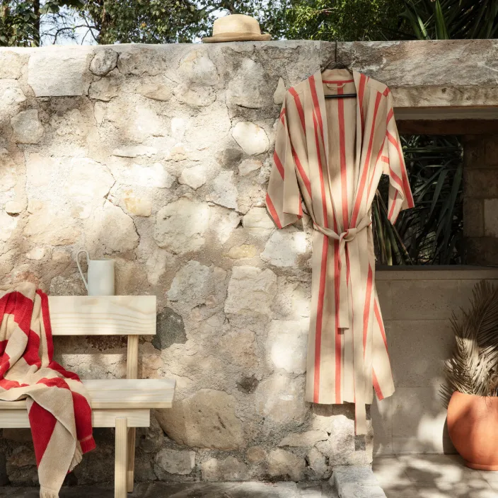An einem ruhigen Morgen fühlt sich nichts besser an, als sich in einen bequemen, kühlenden Bademantel zu hüllen. Die japanisch inspirierte »Field« Robe eignet sich für alle Geschlechter und besteht aus 50 % Naturleinen und 50 % Baumwolle. Sie verfügt über Seitenschlitze und einen passenden Gürtel, sodass sie in den warmen Sommermonaten auch als stylishe, leichte Jacke dienen kann. Erhältlich in Einheitsgröße.