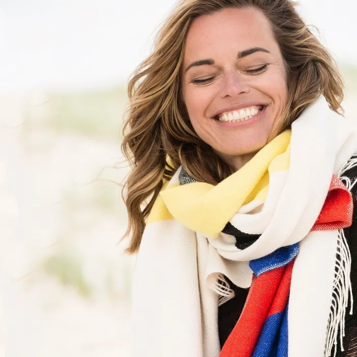 Dieser außergewöhnliche Schal, inspiriert von den Bauhaus-Farben und exklusiv entworfen für die ZEIT, vereint moderne Eleganz mit leuchtenden Farben und zeichnet sich gleichzeitig durch hervorragende Qualität aus. In Peru aus 100 % Baby-Alpaka-Wolle gewebt, ist der Schal ein wahrer Hautschmeichler. Die wertvolle Naturfaser hat hervorragende Thermoeigenschaften und lässt sich sowohl im Winter als auch im Sommer angenehm tragen. Außerdem überzeugt der Schal mit seiner Vielseitigkeit: Er eignet sich als Cape, Plaid, Stola oder Poncho. Seine Leichtigkeit und einfache Kombinierbarkeit machen ihn zu einem absoluten Lieblingsstück. Erhältlich in den Farbvarianten Weiß und Schwarz.