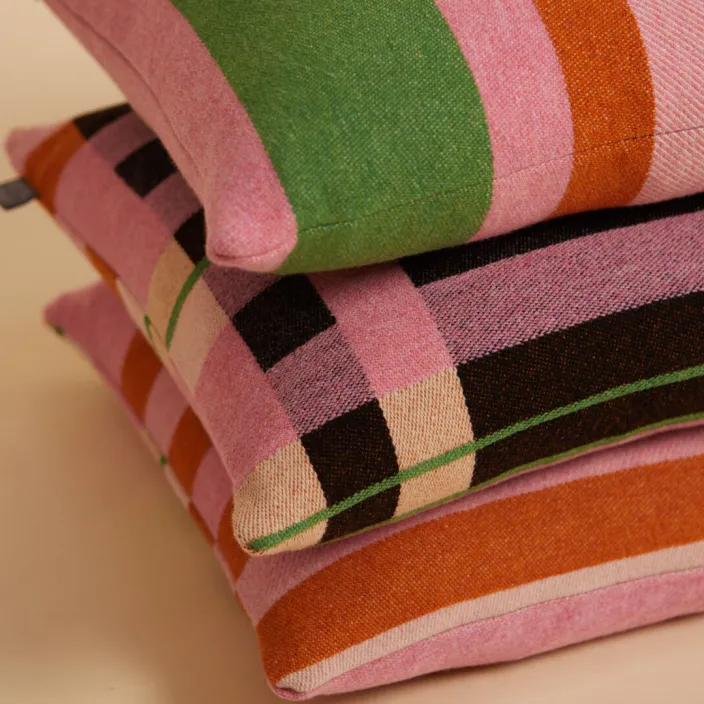 Als das Bauhaus nach Dessau umzog, entwarf Stölzl, die eine Meisterin der Weberei war, eine Decke für die Studentenwohnheime des »Prellerhauses«. Das Original ist ein kühnes Zusammenspiel von Horizontale und Vertikale, Positiv und Negativ. Durch textile Detektivarbeit analysierten Emma und Harriet ein vorhandenes Foto der Originaldecke. Nach Skizzen und Farbmustern wurden die Entwürfe von Hand auf kleinen Webstühlen in unserem Atelier entwickelt, bevor sie in einer Weberei in Lancashire in Originalgröße gewebt wurden.