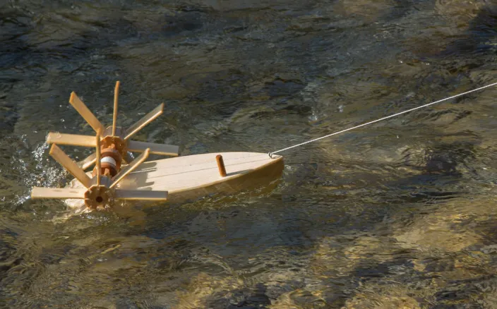 Der Baukausten »Forelle« von Kraul – das Schiff, das gegen die Strömung fährt. In einen strömenden Bach oder Fluss gesetzt, treibt die »Forelle« eine Weile mit der Strömung, bis sie mit Hilfe ihrer Mechanik die Richtung ändert und gegen den Strom zurückfährt. Ein mechanisches Wunderwerk für den sommerlichen Wasserspaß zum selbst Zusammenbauen.