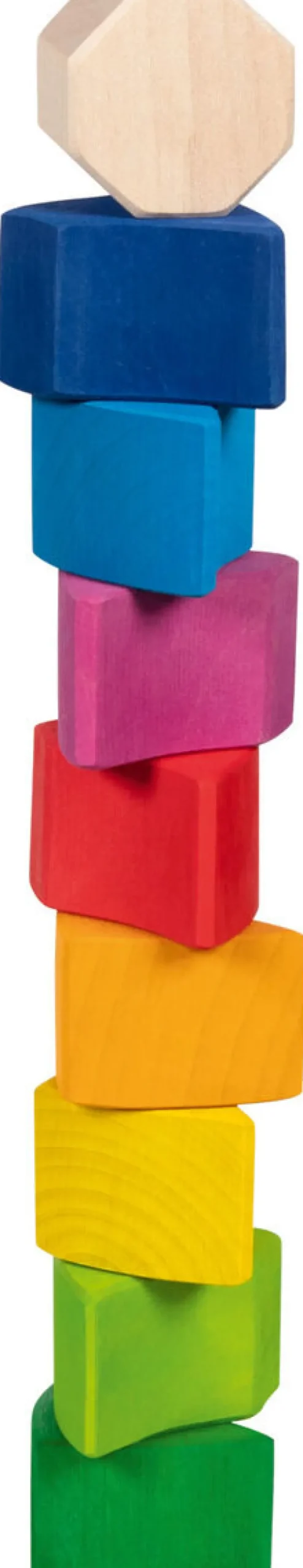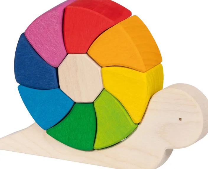 Das Häuschen dieser kleinen Schnecke besteht aus neun Bausteinen in sanften Regenbogenfarben. Die Bausteine können individuell zusammengesetzt, gestapelt und gelegt werden. Durch ihre Lasierung haben die Bausteine eine besondere Haptik, die das Spiel noch angenehmer gestaltet.