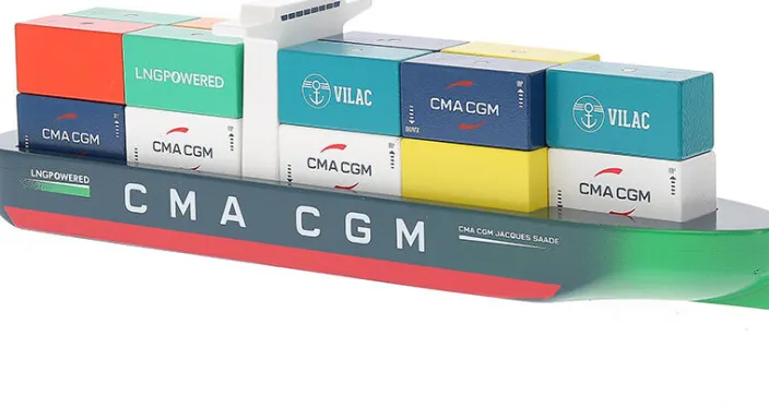 Dieser farbenfrohe Holzfrachter mit 18 magnetischen Containern ist eine Nachbildung der Jacques Saadé, dem ersten Schiff, das mit Flüssigerdgas (LNG) angetrieben wurde. Das Schiff wurde in Zusammenarbeit mit der führenden französischen Reederei CMA CGM hergestellt.