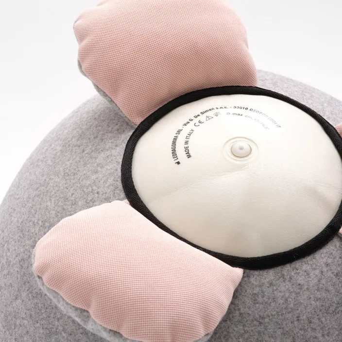 Dank seiner drei Pfoten (besser gesagt, der zwei Pfoten und dem Schwänzchen) rollt der kleine Freund auch in Tobe-Pausen nicht weg. Geduldig bleibt er aufrecht, um stets ein gemütliches Plätzchen zu bieten.