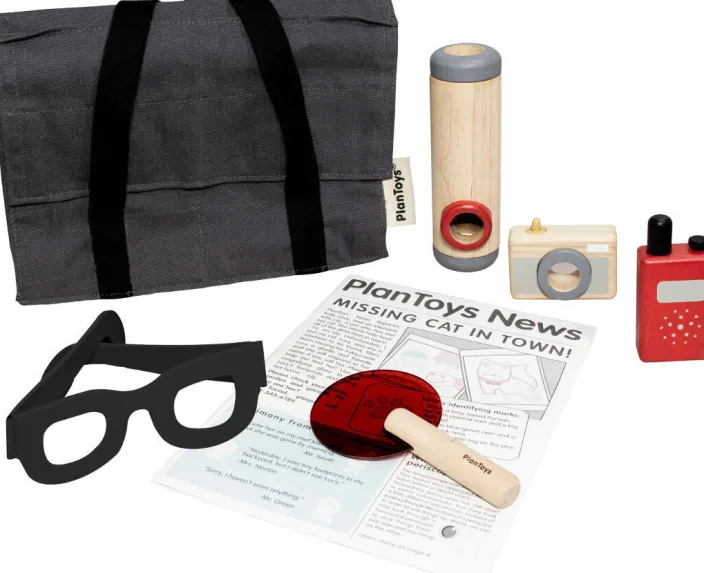 Das umfangreiche Detektivset von Plan Toys beinhaltet alle Utensilien, die kleine Kriminalistinnen und clevere Detektive für die erfolgreiche Auflösung kniffliger Fälle benötigen. In der praktischen Tasche finden sich Kamera, Funkgerät, eine rote Linse um Fingerabdrücke in der Zeitung zu finden und ein Periskop um auch aus dem Versteck alles genau im Blick behalten zu können.