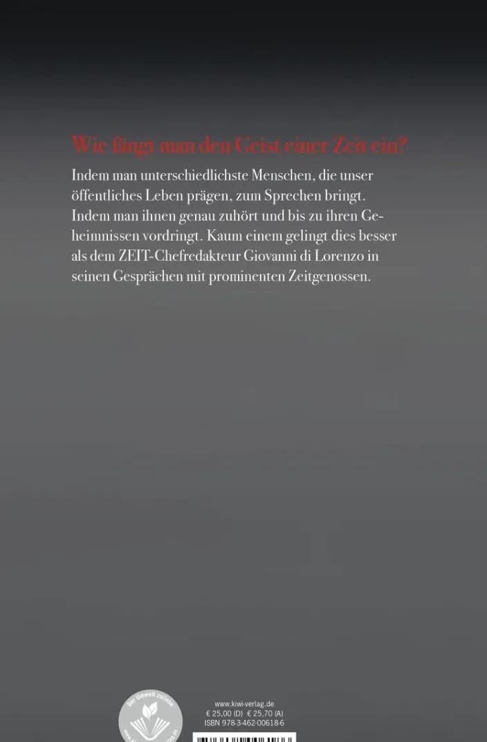 Lesend tauchen wir ein in die Überzeugungen und Biografien von Menschen, die auf unterschiedliche Weise die Gegenwart geprägt haben. Giovanni di Lorenzo schafft dabei eine Atmosphäre seltener Nähe und Offenheit, scheut aber nie die Konfrontation. Und entlockt so auch ausgebufften Medienprofis Dinge, die sie vorher öffentlich nicht gesagt haben.