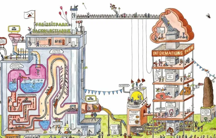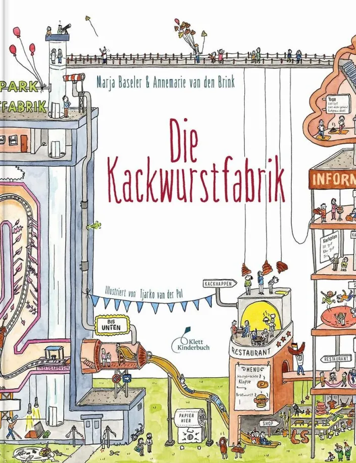 Unser Körper ist eine faszinierende Kackwurstfabrik auf zwei Beinen. Zusammen mit den Kindern Pim und Polly machen wir einen Rundgang durch diese Fabrik – vom Kontrollraum ganz oben über das Säurebad des Magens und die achterbahnartige Fahrt durch den Darm bis hinunter zu den Pförtnern des Enddarms. Wegen Überlastung und Verstopfung steht die Kackwurstfabrik allerdings kurz vor dem Aus. Pim und Polly sind fest entschlossen, sie zu retten.Am Bild einer Fabrik mit all ihren Abteilungen und Maschinen wird hier mit vielen lustigen Wimmelbildern und Info-Kästen erklärt, was bei der Verdauung passiert.Vom Bissen im Mund bis zur Wurst im Klo – eine spannende Werkbesichtigung unseres Verdauungsapparats