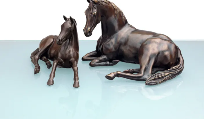 Selbst seit 25 Jahren aktive Reiterin, ist Annette Diekemper eine große Anhängerin der klassischen Reitkunst. Mit großem Einfühlungsvermögen erfasst sie die ganze Vielseitigkeit der faszinierenden Tiere in Rasse, Temperament und Ausstrahlung und vermag es, sie dem Betrachter lebendig und unverfälscht zu vermitteln. Die Araber-Stute mit ihrem Fohlen ist ein Symbol für Harmonie und Geborgenheit. Die sonst so scheuen und aufmerksamen Tiere sind in einem Augenblick familiärer Vertrautheit festgehalten. Bis ins letzte Detail gibt die Bildhauerin das Muskelspiel dieser majestätischen Wesen wieder – ein Meisterwerk moderner Animalierkunst.