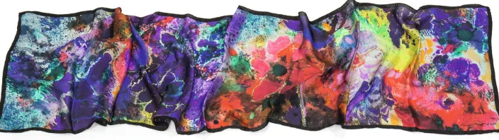 Der Seidenschal »Paradiesstrauß« von Ernst Fuchs vereint kunstvolle Ästhetik und edle Materialien. Details aus dem gleichnamigen Werk des berühmten Künstlers kommen auf der hochwertigen Satin-Seide eindrucksvoll zur Geltung. Die brillante Farbgebung und die weiche, glatte Haptik machen diesen Schal zu einem luxuriösen Accessoire, das Eleganz und Kunst in Perfektion verbindet.
