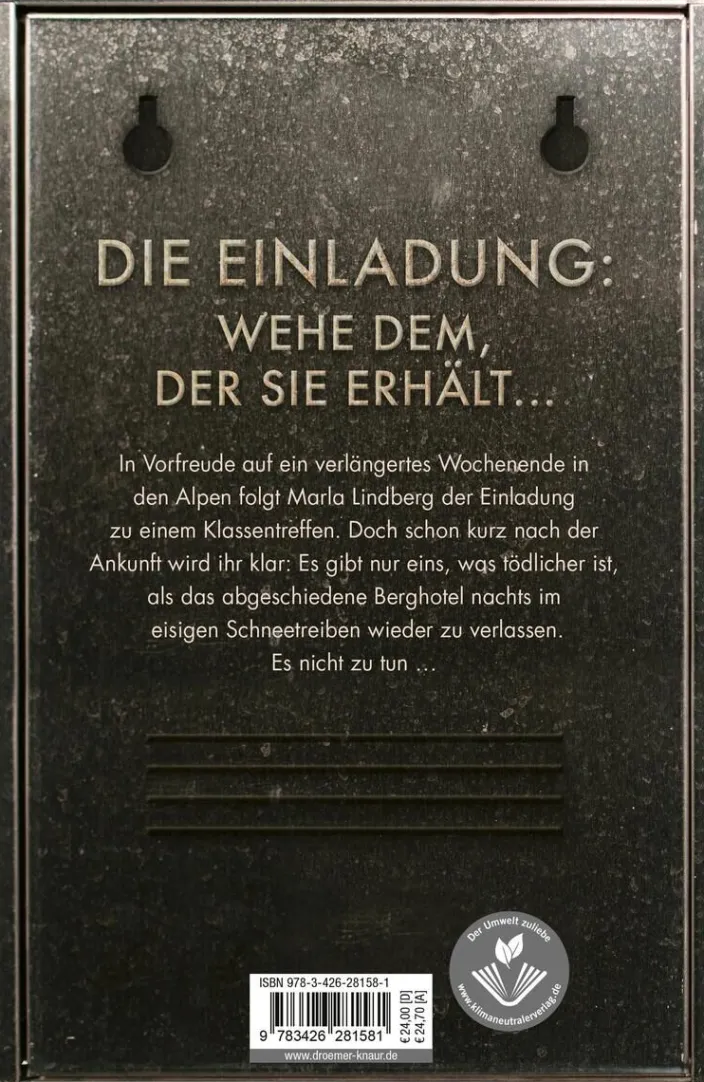 In Vorfreude auf ein verlängertes Wochenende in den Alpen folgt Marla Lindberg der Einladung zu einem Klassentreffen. Doch schon kurz nach der Ankunft wird ihr klar: Es gibt nur eins, was tödlicher ist, als das abgeschiedene Berghotel nachts im eisigen Schneetreiben wieder zu verlassen. Es nicht zu tun …