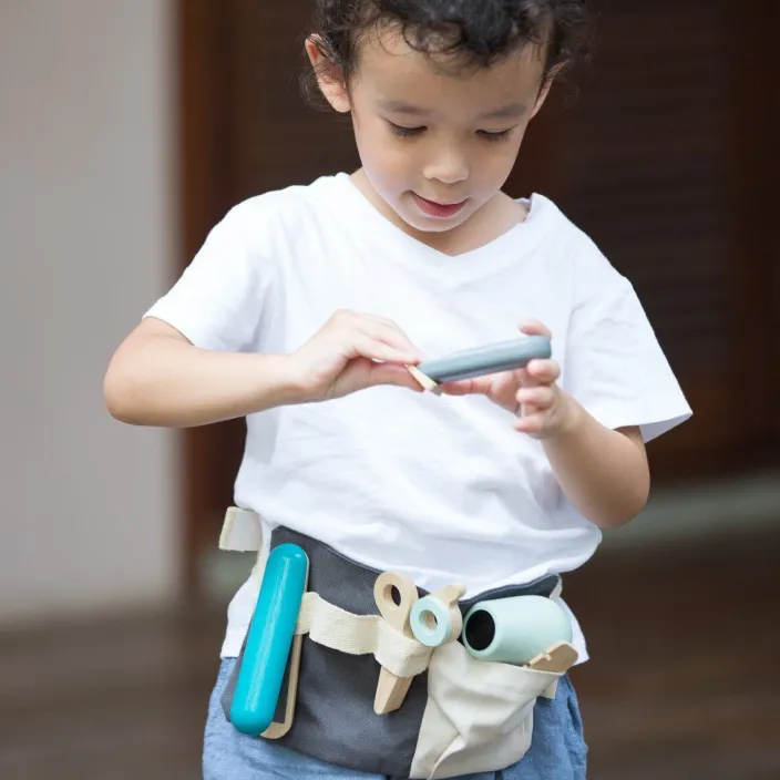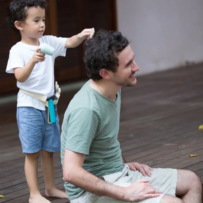 Bob, Dauerwelle oder Kurzhaarschnitt – frisurentechnisch ist alles möglich mit dem umfangreichen und liebevoll designten Friseur-Set von Plan Toys. Mit Föhn, Kamm, Schere, Glätteisen und Rasieren können Ihre Kleinen in kreativen Rollenspielen spielerisch dem Friseurberuf annähern. Durch die praktische größenverstellbare Gürteltasche aus Baumwolle haben sie alle Werkzeuge dafür immer griffbereit. Durch die hochwertig verarbeiteten Utensilien aus Holz werden nicht nur abgeschnittene Strähnen vermieden, sondern auch noch Hemmungen vor dem nächsten Friseurbesuch des Kindes abgebaut.