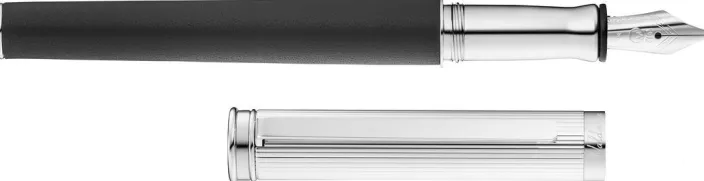 Der Füllfederhalter der Serie »Solon« aus der Manufaktur Waldmann ist aus massivem Sterling-Silber gefertigt und in feinstem schwarzem Rindsleder gekleidet. Die Kappe wird geziert von einem guillochierten Linienmuster. Hochwertig verarbeitet, mit einer Edelstahlfeder und Iridiumpunkt versehen, sorgt der Füllfederhalter »Salon« für ein besonders angenehmes Schreibgefühl.