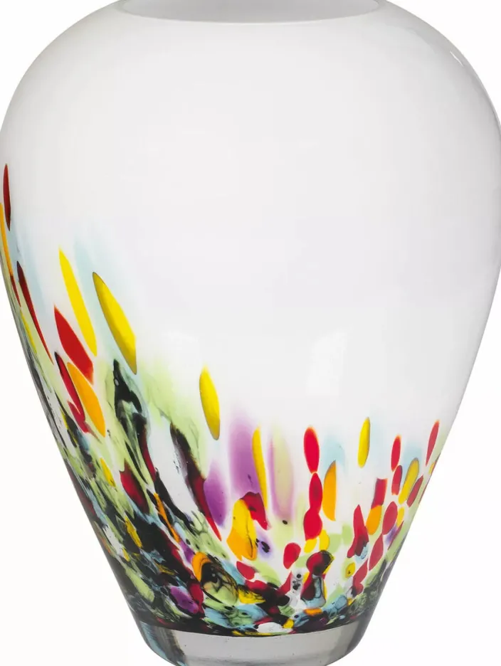 Fröhlich tanzende Farbpunkte breiten sich in einer dynamischen Steigerung über diese Vase aus, die auch ohne Blumen ein wirkungsvolles Accessoire ist.