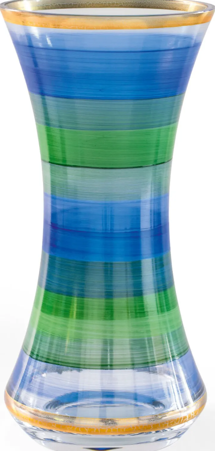Die kunstvolle Farbgebung entsteht durch das Aufbringen von Farbpulver auf die flächig bemalte Vase und verleiht jedem Stück einen individuellen Charakter. Ein Hauch von Luxus wird durch die abschließende Veredelung mit echtem Glanzgold hinzugefügt, wodurch die Vase zu einem außergewöhnlichen Dekorationsobjekt wird.