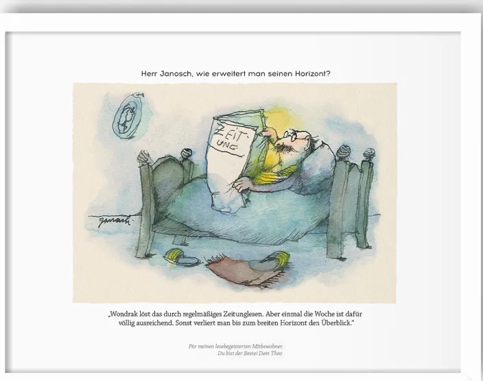 „Jeder lebte schon immer im Paradies, hat es nur nicht gewusst.“ Wer kennt Janosch nicht? Auch mit fast 90 Jahren ist der weltberühmte Autor, Illustrator und Maler noch künstlerisch aktiv und schafft Bilder, die von seinem typischen Humor durchdrungen sind. Janosch ist einer der bedeutendsten Kinderbuchautoren und -illustratoren des 20. Jahrhunderts. Kein deutscher Schriftsteller und Illustrator hat Kinder (und heutige Erwachsene) so geprägt wie Janosch mit seinen Kinderbüchern wie „Oh, wie schön ist Panama“ oder „Post für den Tiger“. Neben seiner Tätigkeit als Autor ist Janosch als freischaffender Künstler tätig. Seine Zeichnungen, Illustrationen und Geschichten wurden nicht nur mit angesehenen Literaturpreisen, sondern auch mit zahlreichen Kultur-, Kunst- und Filmpreisen ausgezeichnet. 1993 bekam Janosch das Bundesverdienstkreuz als Anerkennung für sein künstlerisches Schaffen verliehen. Der künstlerische Anspruch auch in den Illustrationen von Janosch ist bis heute sehr ausgeprägt. Sein unverwechselbarer Stil ist in Radierungen, Aquarellen auf Papier und Leinwandarbeiten erkennbar. Seine Werke sind voller humoristischer Details, die aber auch Kritik an der Gesellschaft zum Thema haben. Seine Farben unterstützen die jeweilige Thematik und haben starken Symbolcharakter. Ein wichtiges Element ist die Sprache: Gedanken, Sprüche und Konversationen sind in die Bildkomposition mit eingebunden, als Teil des Ganzen. Auch mitten im Raum, als Schild oder Sprechblase, sind die Sprachelemente ein wichtiges Stilmittel in Janoschs Arbeiten. Gängige Konventionen haben den fast 90-Jährigen nie interessiert. Er nimmt die Inspirationen für seine Kunst aus gesellschaftskritischen Werken, Büchern und Gesprächen mit Politikern, Schriftstellern und Kunstinteressenten. Diese Eindrücke fließen in seine Werke ein, nicht zuletzt in seine Serie über sein Alter Ego »Wondrak« für das ZEITmagazin, in der er sich sechs Jahre lang (von 2013 bis 2019) kritisch, aber humorvoll mit dem Zeitgeschehen auseinandergesetzt hat. Exklusiv im ZEIT Shop können nun auch personalisierte Grafiken erworben werden.