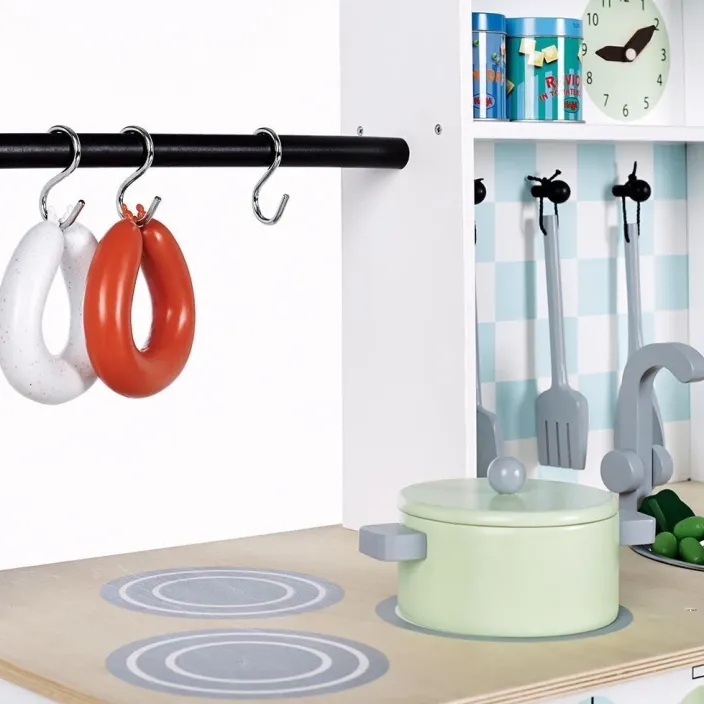 - Lieferumfang: 2 Türen; Waschschüssel; drehbare Knöpfe (mit Klickgeräusch); Kochbesteck (3-teilig); 2 Töpfe; 2 Rollen