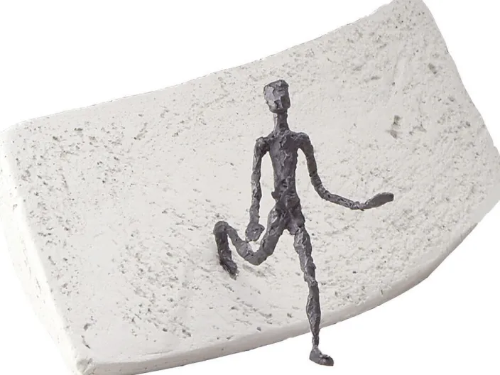 Es lässt sich viel Kraft gewinnen, wenn alte Muster und feste Denkgewohnheiten abgelegt und mutig neue Wege beschritten werden. Die Skulptur zeichnet eine Dynamik aus, die sie aus dem tiefen Kontrast zwischen dunkel patinierter Bronze und hellem Steinguss-Sockel gewinnt.