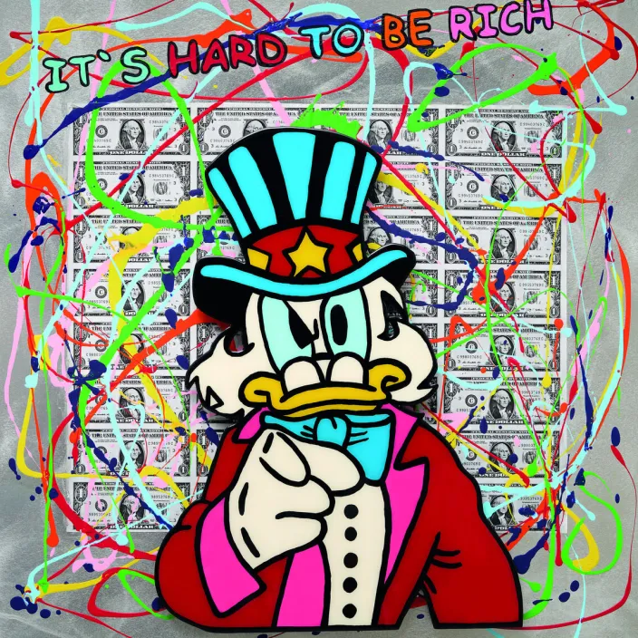 Das Bild »It’s Hard To Be Rich« (2023) von Michael Pfannschmidt vereint knallige Farben und ikonische Comicfiguren in einem modernen Kunstwerk voller Humor und Ausdruckskraft. Durch seine einzigartige Technik verleiht Pfannschmidt dem Motiv eine lebendige Tiefe, die Betrachter zum Schmunzeln bringt und zum Nachdenken anregt. Diese limitierte Edition auf Aluminiumplatte ist auf 199 nummerierte Exemplare begrenzt und wird mit einem handsignierten Zertifikat geliefert – ein echtes Sammlerstück für Liebhaber zeitgenössischer Pop-Art.