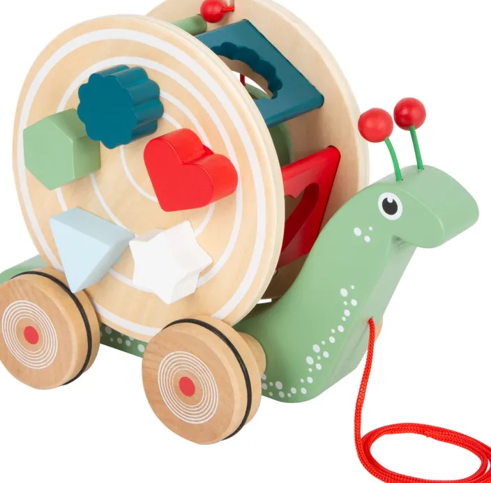 Diese »Nachzieh-Stecktier Schnecke« mit elastischen Fühlern und freundlichen Augen motiviert zum Laufen lernen. Während des Ziehens dreht sich das abnehmbare Schneckenhaus, erzeugt ein klackerndes Geräusch durch die darin befindlichen Stecksteine und fördert spielerisch die Farb- und Formerkennung durch das Anschrauben der Steine an der zweiten Seite des Schneckenhauses. Die Kombination von natürlichem Holz und modernen Farben macht dieses Ziehtier zu einem echten Blickfang! Das abnehmbare Schneckenhaus ist separat als Aufbewahrung für die bunten Steckelemente nutzbar. Dank einer seitlichen Tür mit Gummibandverschluss und einer Perle als Griff sind die Spielsteine leicht zugänglich. Aufgeschraubte Spielsteine sorgen zudem für eine geräuschärmere Aufbewahrung, da sie beim Ziehen nicht mehr im Haus klappern. Ein cleveres Motorik-Spielzeug für steck- und schraubbegeisterte Kinder.