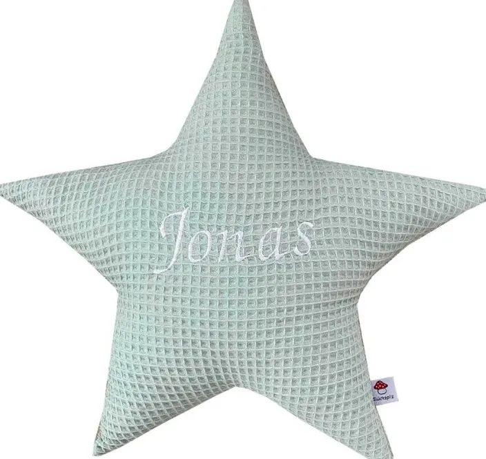 Schenken Sie Ihrem Kind mit dem personalisierbaren Sternkissen einen kuscheligen Freund für alle Lebenslagen. Ob als Kuschelfreund oder Begleiter in dunklen Nächten, dieser Seelentröster wird Ihr Kind viele Jahre lang begleiten. Auch als dekorativer Blickfang im Kinderzimmer oder Kinderbett macht dieses süße Kissen, dass es in zwei wunderschönen Pastellfarben gibt, etwas her. Das Kissen Inlett besteht aus Waffelpique und ist durch den auf der Rückseite eingearbeiteten Hotelverschluss separat vom Bezug waschbar. Die Sternkissen sind in liebevoller Handarbeit aus 100% Ökotex zertifizierter Baumwolle hergestellt und somit 100% Allergiker freundlich.