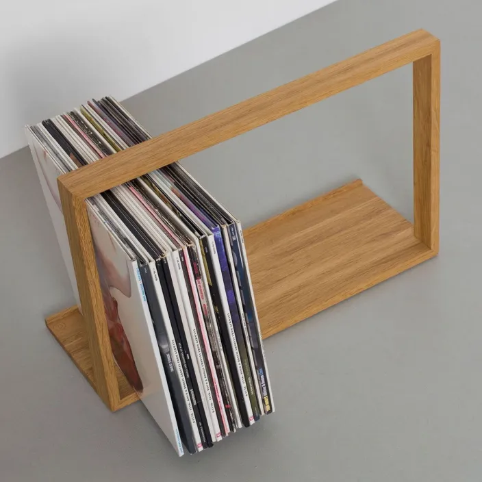 Zeitlos, individuell und in Handarbeit gefertigt. Der Schallplattenständer »b-seite« bietet wahlweise Platz für über 50 oder 110 Schallplatten Ihrer Wahl und setzt sie wirkungsvoll in Szene. Hier stehen sie gut sortiert und immer griffbereit. Das Holzregal ist komplett aus Eiche gefertigt und der Rahmen des Plattenständers auf Gehrung gearbeitet. Er lagert auf einer massiven Holzplatte, die der luftigen Konstruktion die nötige Schwere für einen festen Stand gibt.