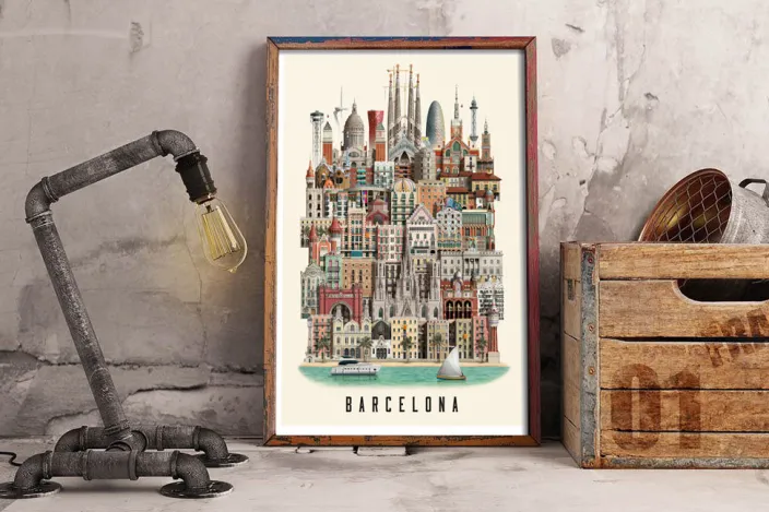 Barcelona bietet einige der anmutigsten Jugendstilgebäude Europas. Zu den berühmtesten gehören die Sagrada Familia, Casa Batlló und der Parc Güell, die alle vom berühmten katalanischen Architekten Antoni Gaudí entworfen wurden. Die Atmosphäre der Stadt wird stark von den Gebäuden bestimmt, die einen überwältigenden Reichtum an Details, Mustern und Farben aufweisen. Auf dem Poster finden Sie viele der berühmtesten Gebäude Barcelonas, sowohl alte als auch neue. Ob Katholizismus oder Fußball die vorherrschende Religion der Stadt ist, ist schwer zu sagen, daher werden sowohl das Camp Nou als auch die gotische Kathedrale Seite an Seite mit mehr als 50 anderen einzigartigen Gebäuden Barcelonas dargestellt.