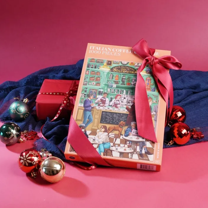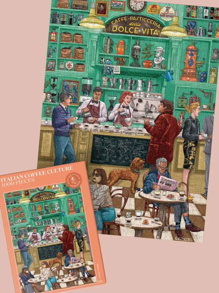 Entdecken Sie die italienische Kaffee-Kultur mit dem hochwertigen Puzzle »Italienische Kaffee-Kultur« von Water & Wines. Mit 1000 Teilen bietet dieses Puzzle eine anspruchsvolle Herausforderung und gleichzeitig eine faszinierende Reise durch die Geschichte und Tradition des italienischen Kaffees. Die handgezeichneten Illustrationen erfassen die Essenz einer italienischen Café-Kultur und bieten gleichzeitig fundierte Informationen über die reiche Geschichte und Tradition des Kaffees. Tauchen Sie ein in die Welt des italienischen Kaffees und erweitern Sie Ihr Wissen über die Kaffee-Etikette, regionale Frühstücksgewohnheiten und Zubereitungsmethoden.