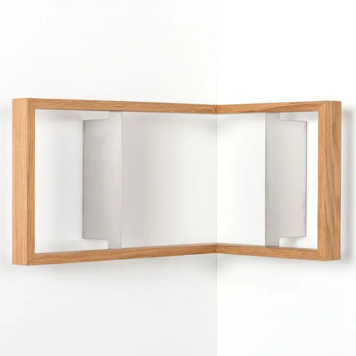 Das Regal »b-eck« nutzt Ecken für sich. Wie das Bücherregal »b« lässt es Bücher scheinbar schweben und setzt sie somit wirkungsvoll in Szene. Ob Kunstband, ZEIT-Edition oder Taschenbuch – einzig der massive Holzrahmen scheint den Büchern ihren Halt zu geben. Ohne Bücher lüftet sich das Geheimnis: Eingelassene Edelstahlwinkel halten die Konstruktion an der Wand und lassen die Bücher schweben.
