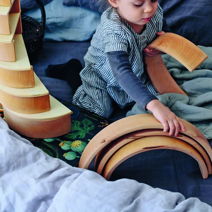 Der Regenbogen von »GRIMM’S« besteht aus 12 Bauklötzen und ist durch seine besondere Form ein sehr vielseitiges Spielzeug: Die Kleinsten stapeln, bauen und sortieren, die Größeren wiegen Ihre Puppen, bauen Tunnel, Häuschen und Skulpturen. Der Regenbogen lädt zum kreativen und freien Spielen ein! Wahlweise in der naturbelassenen Variante oder im Regenbogenlook.