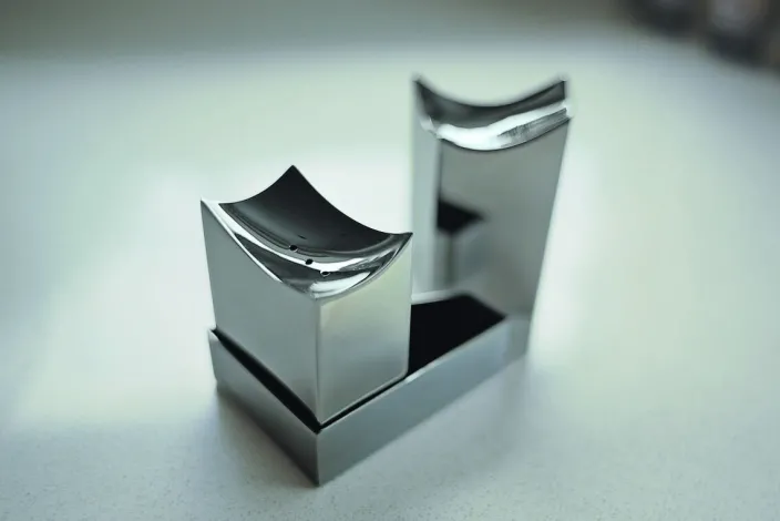 Die Streuer wirken einzeln betrachtet wie eine moderne Skulptur, platziert man sie zusammen in ihrem Tablett, ergeben sie eine Miniatur aufregend ähnlich der Elbphilharmonie®.