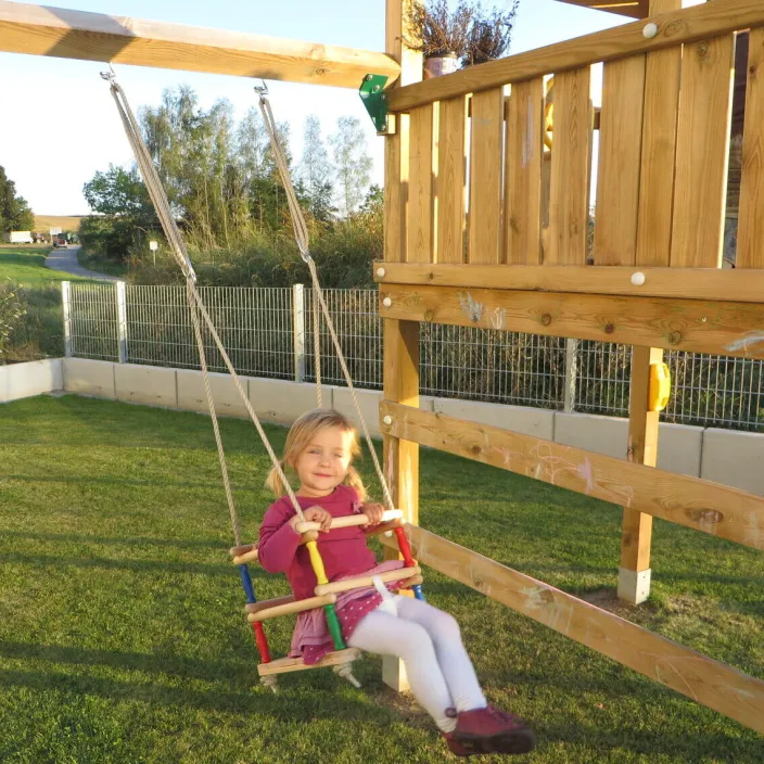 Zur Herstellung wurden hochwertige Hölzer verwendet, die anschließend geölt wurden und somit witterungsbeständiger sind als bei einer herkömmlichen Lackierung. Für die Sicherheit Ihres Kindes sorgen Querstreben, welche rundherum etwa auf Brusthöhe verlaufen und ein Herausfallen verhindern. Hier schützt zusätzlich auch ein Sicherheitsgurt, welcher zwischen den Beinen verläuft. Die Seile bestehen aus Polypropylen anstatt aus Naturmaterial wie beispielsweise Sisal, welches bei kühlerer und feuchter Witterung zu verrotten droht. Polypropylen hingegen ist witterungsbeständig und wesentlich widerstandsfähiger.