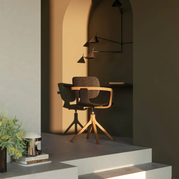 Inspiriert von Bürostühlen aus Zeiten des Polstergleich 1935 und anderen Klöber Klassikern mit Rückenbügel folgt das Design dem Bauhaus-Ansatz „Weniger ist mehr“. CoMeet C35 besticht durch sein minimalistisches und wohnliches Design. Die Höhe des Stuhls ist im Handumdrehen durch ein puristisches Drehgestell anpassbar.