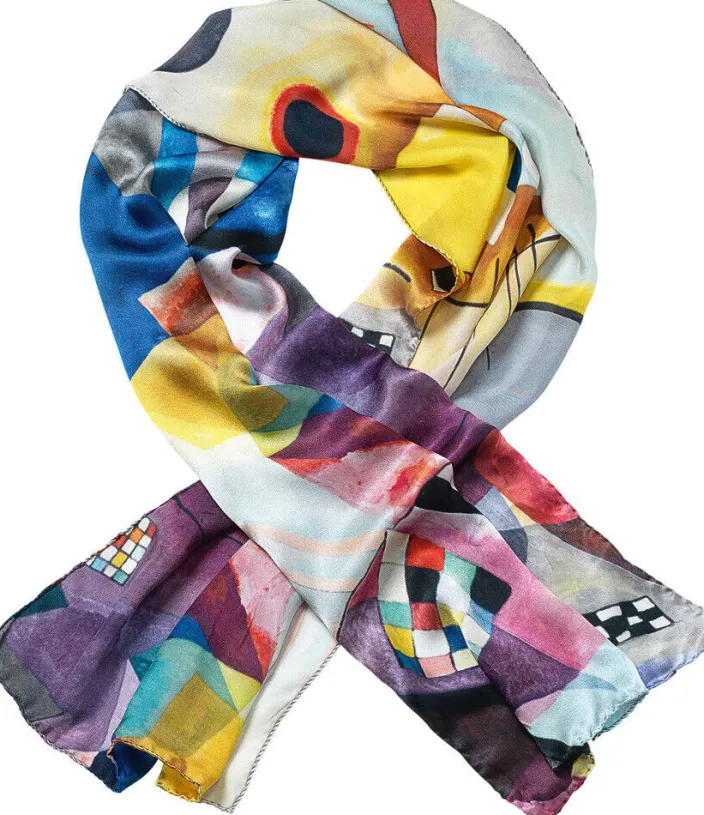 Dieser farbenfrohe Seidenschal ist dem berühmten Original- Gemälde »Gelb-Rot-Blau« aus dem Jahr 1925 nachempfunden.