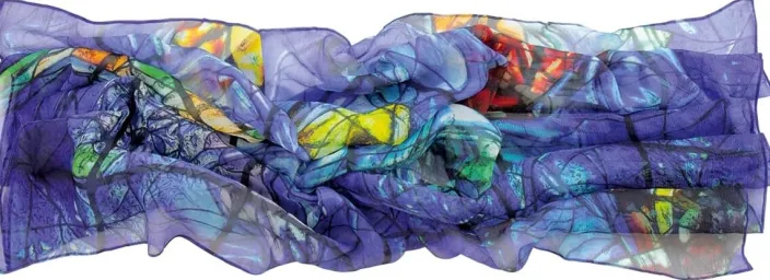 Marc Chagall entwarf »Die Schöpfung der Welt« für die Gestaltung eines Kirchenfensters. Auf diesem feinen Tuch aus 100% reiner Crêpe-Georgette-Seide kommt die Farbstimmung ausdrucksvoll zur Geltung.