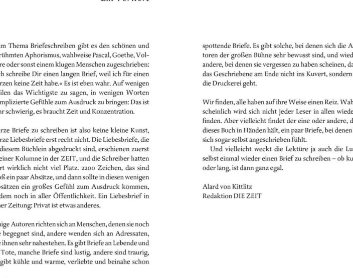 Wer kennt ihn nicht, diesen einzigartigen Menschen, dem man längst einmal sagen wollte, wie viel man ihm verdankt? Und was gibt es Schöneres, als dies in Form eines Briefes zu tun? In der Wochenzeitung DIE ZEIT gibt es seit November 2015 »Liebesbriefe« dieser besonderen Art zu lesen. So verneigt sich die Schriftstellerin Ulla Hahn vor ihrem Volksschullehrer; die Fraktionsvorsitzende der Grünen, Katrin Göring-Eckhardt, erinnert sich an ihre Oma; der ARD-Meteorologe Sven Plöger schreibt an seinen fliegenden Nachbarn; NDR-Talk-Show-Moderator Hubertus Meyer-Burckhardt sagt Rod Stewart, dass er ihm sein Leben gerettet hat, und Rapper Prinz Pi wünscht seinem Sohn, dass wenigstens seine kleine Welt noch heil ist. Insgesamt 45 persönliche Liebeserklärungen versammelt dieser schön gestaltete Band.