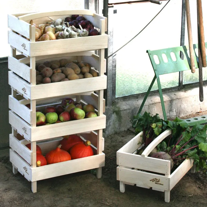 Die stabile Kiste eignet sich perfekt zur Lagerung von Obst und Gemüse und ist zu mehreren gestapelt ein praktisches Vorratsregal. Dank der offenen Vorderseite der Stiege liegt die Ernte jederzeit griffbereit. Aus regionalem Holz gefertigt in Werkstätten für Menschen mit Behinderungen.