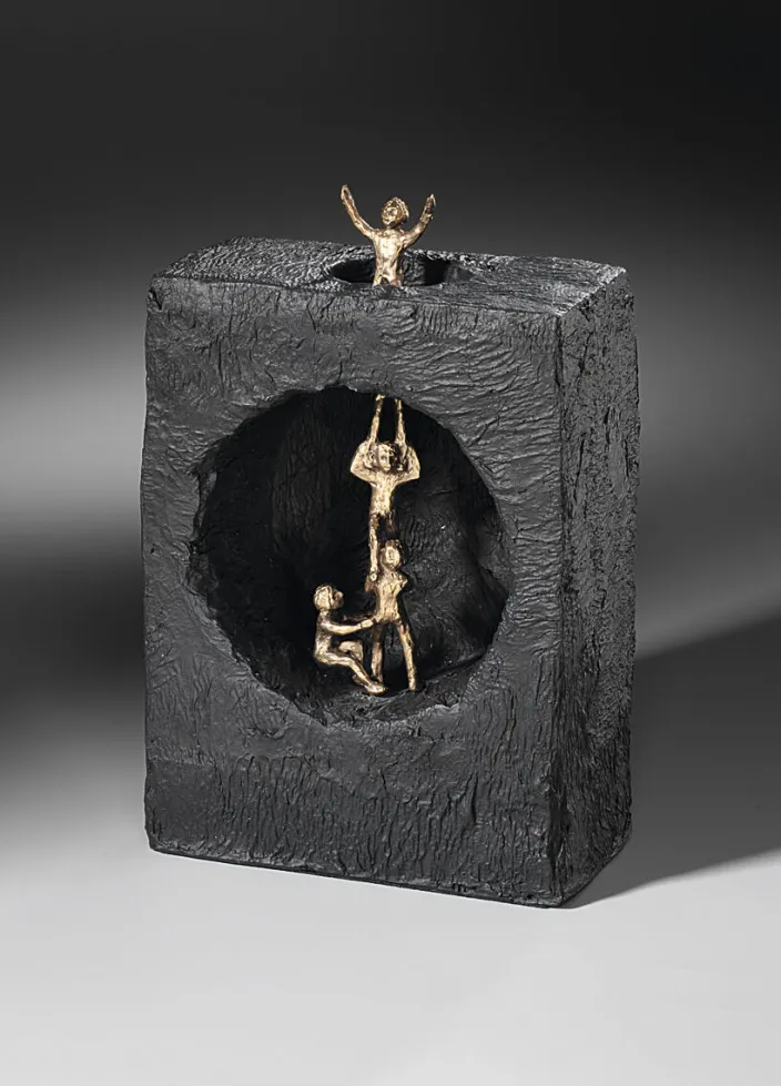 Allein schafft keiner den Weg heraus, zusammen ist es ein Kinderspiel! Botschaften des täglichen Lebens, liebevoll auf den Punkt gebracht: Mit gezieltem Kontrast zwischen golden schimmernder polierter Bronze und dem schwarz kolorierten Kunststein verschafft die gelernte Goldschmiedin Kerstin Stark ihren Tischskulpturen eine besondere Leuchtkraft.
