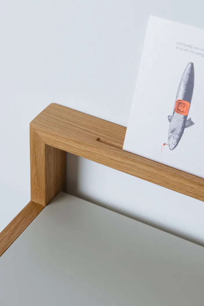 Die Arbeitsfläche besteht aus Eichenholz, belegt mit Möbellinoleum und ist in einen Rahmen aus geölter Eiche eingefasst. Die gefräste Nut am umlaufenden Steg verhindert das Wegrollen der Stifte und bietet Platz für Postkarten und Memozettel.