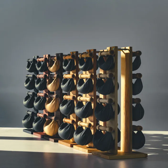 Alle Swing Hanteln werden von Hand genäht und sind mit einem Eisengranulat befüllt, welches die Unwucht in der Bewegung unterstützt, da es sich im Ledersack verlagern kann. Nach dem Workout können Sie Ihre acht Swing Hanteln aus handgenähtem Echtleder am Swing Turm platzsparend und optisch ansprechend verstauen.