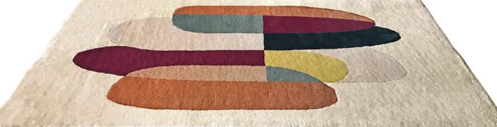 Mit seinen warmen Farben und den abstrakten Formen ergibt sich ein harmonisches Gesamtbild des Teppichs, der jedem Raum einen besonderen Charme verleiht.