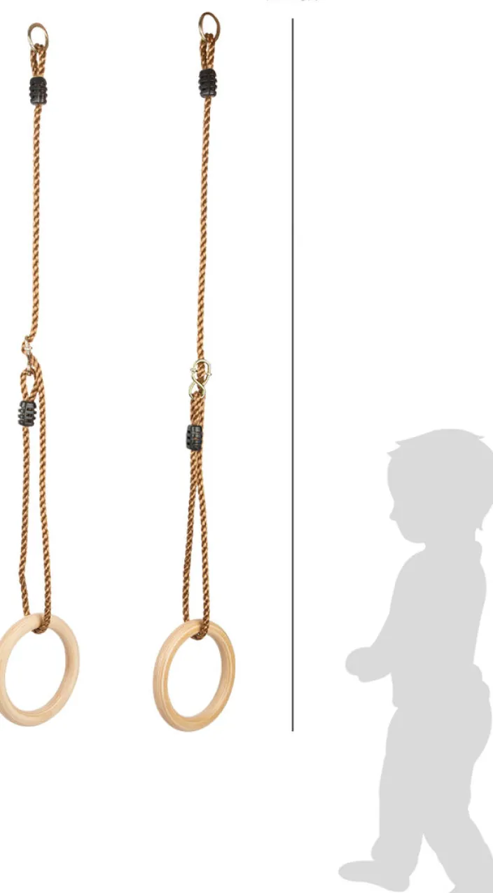 Höhenflüge vorprogrammiert! Dank griffigem Holz und passender Größe haben auch Kinder mit kleineren Händen an diesen Turnringen riesigen Schaukelspaß. Da werden schon mal die besten Übungen für die nächste Schulsportstunde im heimischen Garten oder im eigenen Zimmer geübt! Dabei trainieren die angehenden Akrobaten ihr Schwung- und Rhythmusgefühl ebenso wie Kraft, Balance und Ausdauer. Die verstellbaren Bänder sind besonders praktisch, um die Turnringe auf die persönliche Körpergröße einzustellen. Die Ringe kommen mit längenverstellbaren Seilen und Metallringen, die ein schnelles und müheloses Auf- und Abhängen ermöglichen. Die Turnringe sind sowohl im Innenbereich als auch im Garten geeignet.