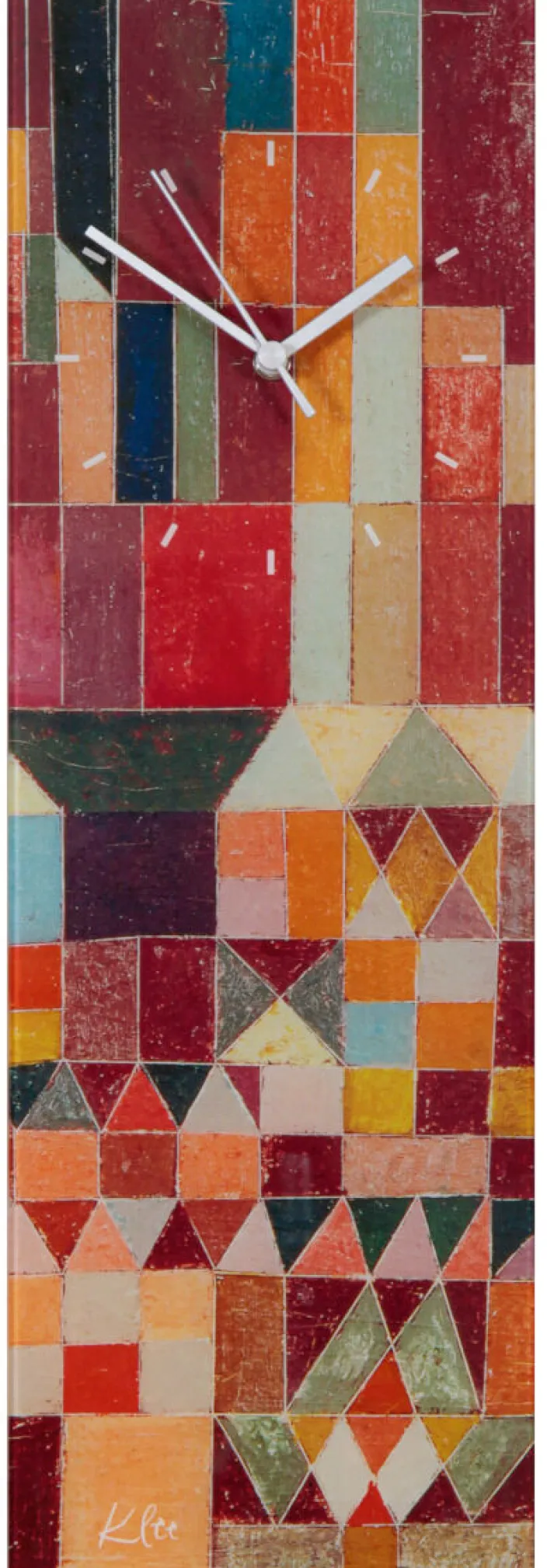 Eine Uhr wie ein Gemälde von Paul Klee. Diese Wanduhr aus Glas ist kein gewöhnlicher »Zeitmesser«, sondern ein ausdrucksvolles Wandbild mit besonderer Funktion!