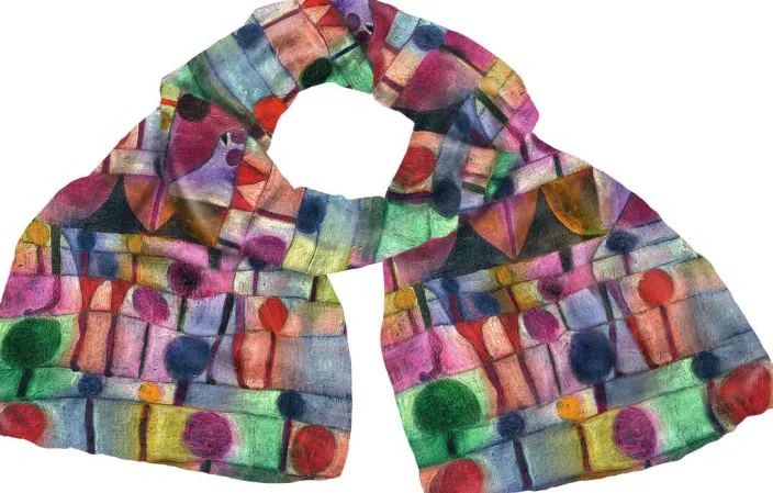 Kunstwerke in modische Accessoires umzuwandeln versteht die Künstlerin Petra Waszak nur zu gut. Bei diesem Schal aus 100 % feinster Satin-Seide ließ sie sich von Paul Klees Gemälde »Kamel in rhythmischer Baumlandschaft« inspirieren.
