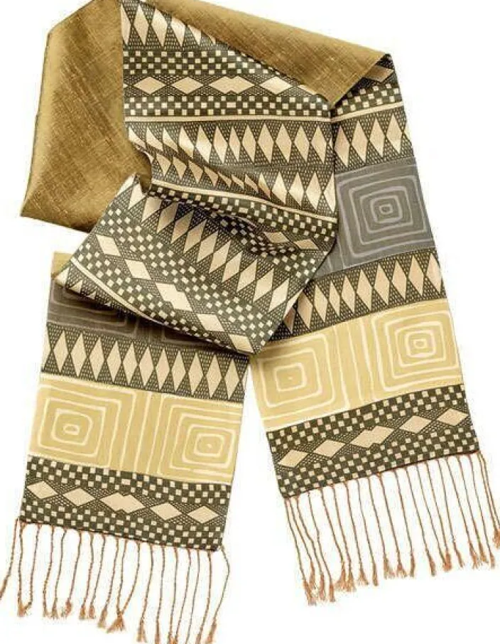 In einer handgefertigten Edition verarbeitet die Künstlerin historische Vorbilder aus Afrika zu Accessoires von zeitloser Ästhetik. Der Schal mit seinen geometrischen Mustern besteht aus 100 % reiner Seide, die Rückseite ist in Wildseiden-Optik gestaltet.