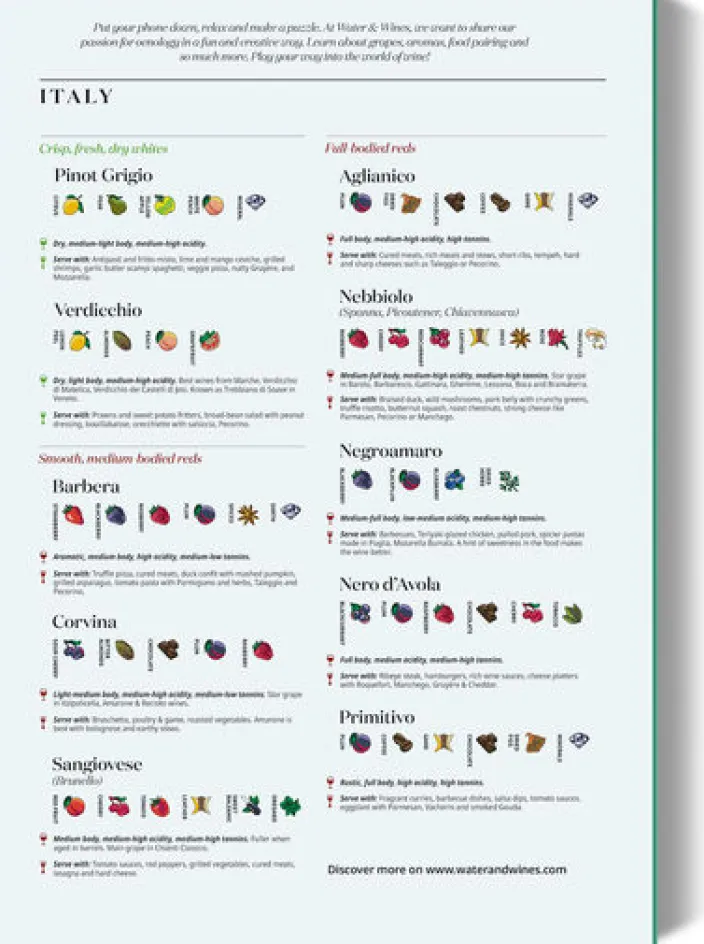 Die beiliegende Box wurde von Sommelier-Experten zusammengestellt und enthält Traubenprofile der berühmtesten italienischen Trauben sowie Tipps für die Kombination mit Speisen, damit Sie die wahren Aromen des Dolce Vita genießen können. Machen Sie sich bereit, die Tiefen der italienischen Weinkultur zu erforschen und genießen Sie ein rätselhaftes Erlebnis wie kein anderes!