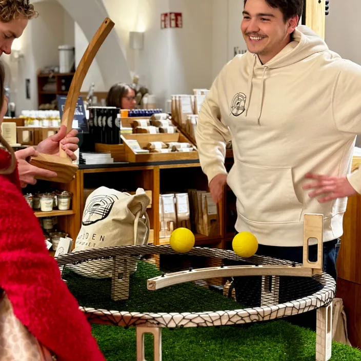 »Wooden Roundnet« mit seinem nachhaltigen Holzrahmen ist ein hochwertiges und trendiges Produkt. Ein unverwechselbares Spiel, welches im eigenen Garten, am Strand, in der Sporthalle oder einfach auf der nächstbesten Freifläche ein spannendes Teamsporterlebnis sowie Spaß garantiert.
