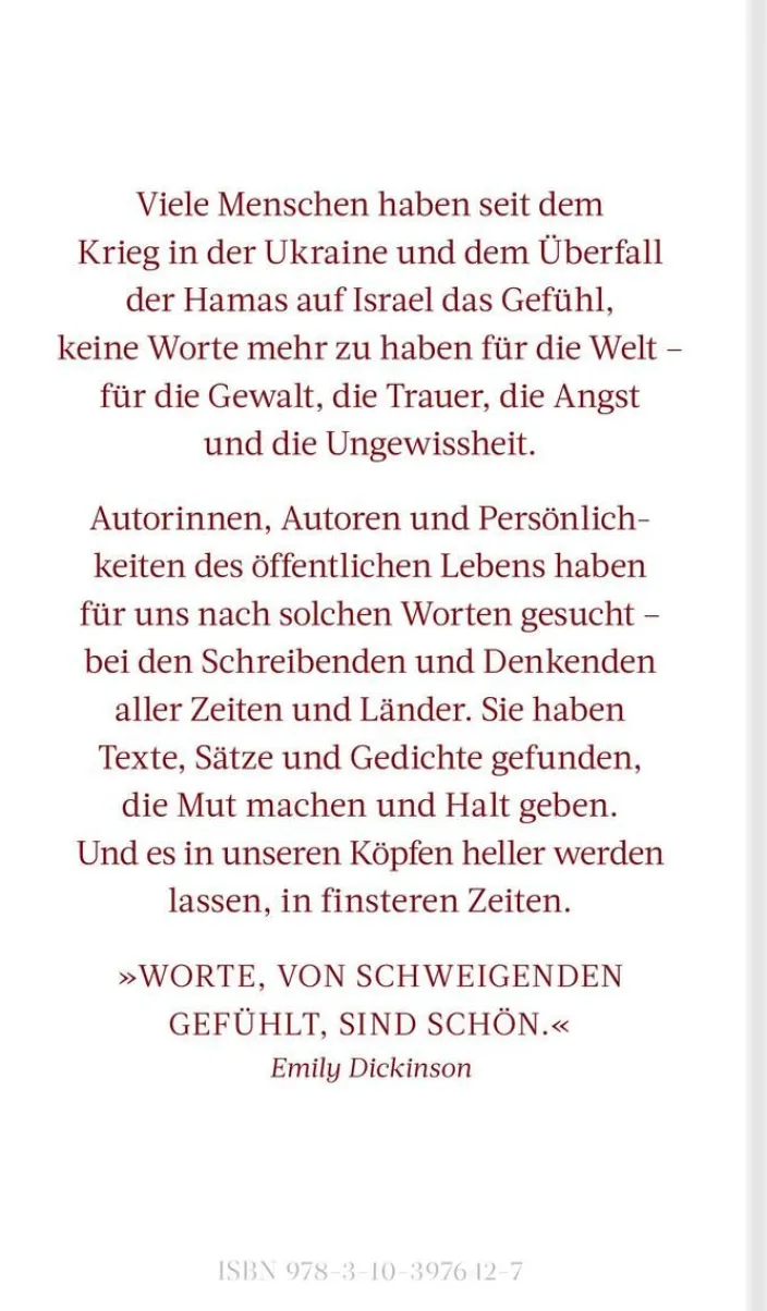 Autorinnen, Autoren und Persönlichkeiten des öffentlichen Lebens haben für uns nach solchen Worten gesucht – bei den Schreibenden und Denkenden aller Zeiten und Länder. Sie haben Texte, Sätze und Gedichte gefunden, die Mut machen und Halt geben. Und es in unseren Köpfen heller werden lassen, in finsteren Zeiten.