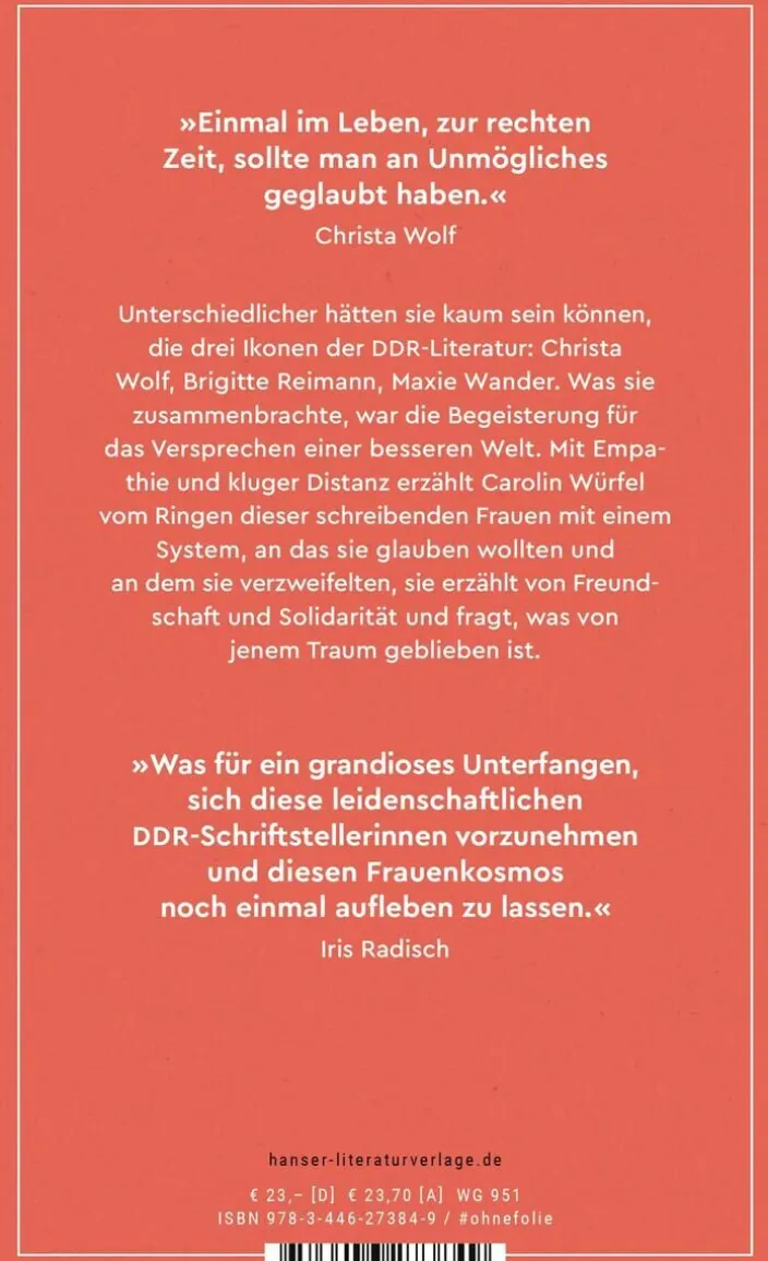 Christa Wolf, Brigitte Reimann und Maxie Wander – Carolin Würfel porträtiert diese drei Ikonen der DDR-Literatur und wirft einen modernen Blick auf das große Versprechen des Sozialismus.Christa Wolf, Brigitte Reimann, Maxie Wander – waren sie Träumerinnen oder Macherinnen, diese drei Frauen, die zu Ikonen der DDR-Literatur wurden? In ihrem atmosphärischen Porträt zeigt Carolin Würfel drei Schriftstellerinnen, die im Temperament unterschiedlicher kaum sein könnten und die doch eines eint: die Begeisterung für das Versprechen des Sozialismus, die Bereitschaft, den Traum vom neuen Menschen in ihrem Alltag, ihrer Arbeit und ihren Beziehungen umzusetzen. Mit welchem Selbstbewusstsein diese Frauen in den 1950er- und 1960er-Jahren ihre Ziele verfolgen, sich dabei als Freundinnen stützen – wie ihre Träume aber auch platzen, davon erzählt Carolin Würfel inspiriert und mitreißend und lässt ein Stück Zeitgeschichte lebendig werden.