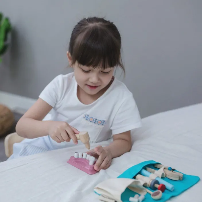 Das Zahnarzt-Set von Plan Toys enthält alle Utensilien, die ein kleiner Zahnarzt für die erfolgreiche Behandlung benötigt. Mit Spiegel, Spritze, Bohrer und Zange kann nach Herzenslust kontrolliert, gebohrt und der ein oder andere Zahn gezogen werden. Im mitgelieferten Gebiss lassen sich hierfür drei der acht Zähne über ein Klettverschlusssystem gegen drei Zähne mit brauner Kaufläche austauschen und dann entfernen. Um es gar nicht erst so weit kommen zu lassen, können Ihre Kleinen mit der Holzzahnbürste spielerisch den Umgang mit Zahnpflege und dem Zähneputzen üben und sind so perfekt vorbereitet für den nächsten Zahnarztbesuch.